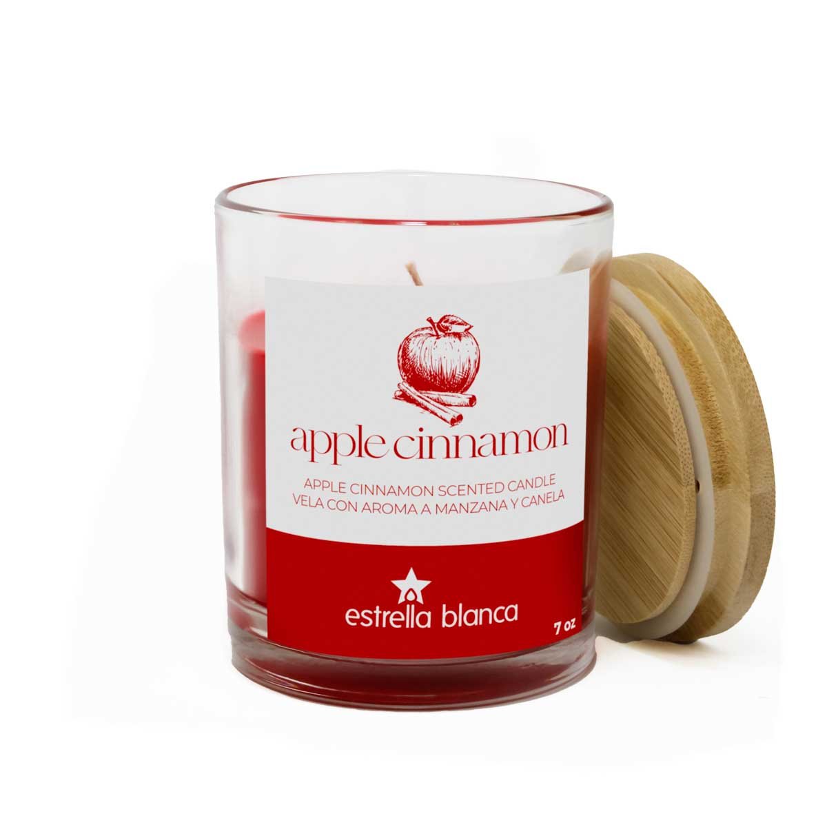 Fill your home with the warm, inviting scent of apples and cinnamon with the Estrella Blanca Apple Cinnamon Scented Candle. This natural soy wax candle is crafted with a clean-burning cotton wick and topped with a stylish wooden lid for a touch of rustic charm. You can choose from 7oz size.